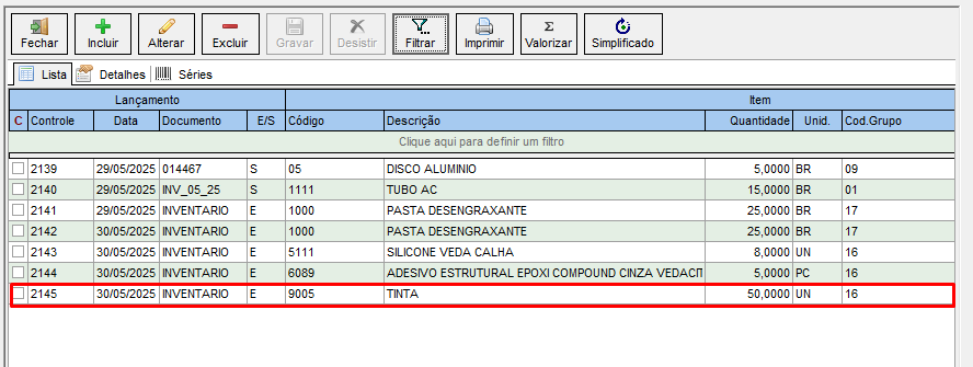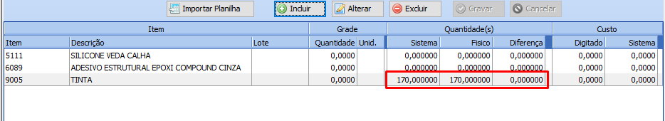 5 – Caso seu item não apareça isso é causado pois a quantidade inserida na movimentação foi igual a quantidade que o sistema possui, então não temos diferença.