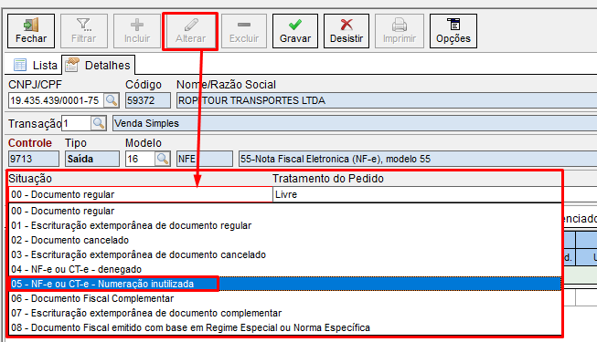Caso 1 – Um documento exista com alguma numeração do intervalo, devemos acessar o caminho abaixo, filtrar e alterar os seguintes campos.