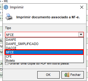 4 – Em imprimir devemos ver se nossa nota é 65 caso seja colocamos nfce ou se for 55 utilizamos DANFE.