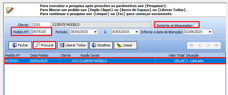 3 – Desmarcamos o somente bloqueados, digitamos o numero do nosso pedido sem o ponto antes do 25 exemplo: 753.25 iremos digitar 75325,  e clicamos duas vezes no nosso pedido.