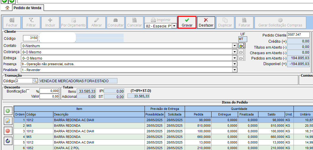 14 – Podemos alterar todo o pedido e clicar em gravar.
